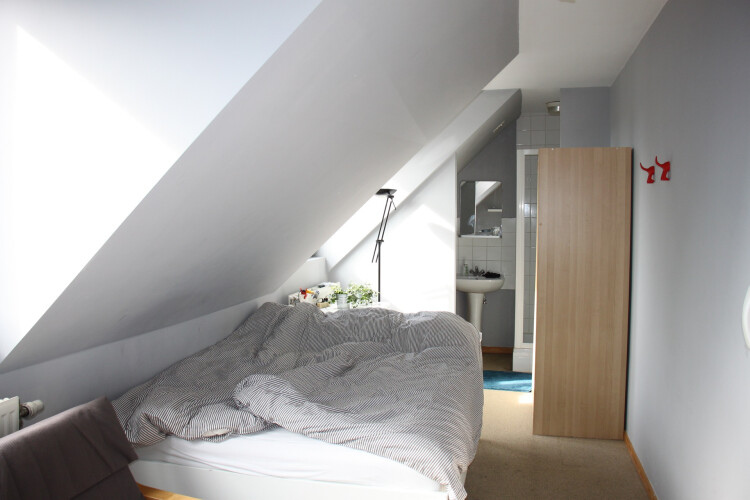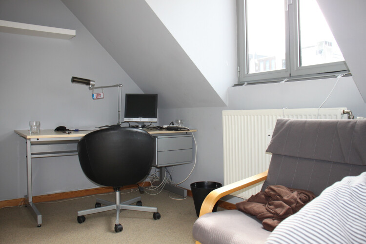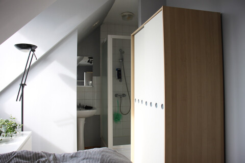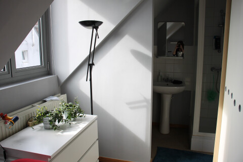 Kamer 10 is een ruime kamer op de derde verdieping, onder het dak. Ze heeft een eigen douche cel en lavabo. Je deelt de keuken met je andere kot genoten op de gang.