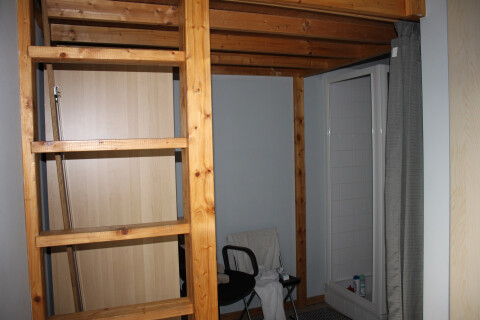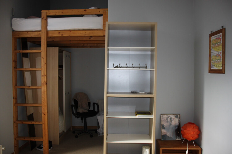 Kamer 1 ligt op de eerste verdieping van het gebouw aan de achterkant. Het is een gezellige kamer met hoogslaper en eigen douche cel en lavabo. De WC en keuken zijn op de gang en deel je met een aantal kot genoten op je verdieping. De kamer wordt verhuurd met een éénpersoons matras, boekenkast, kleerkast, bureau en bureaustoel.