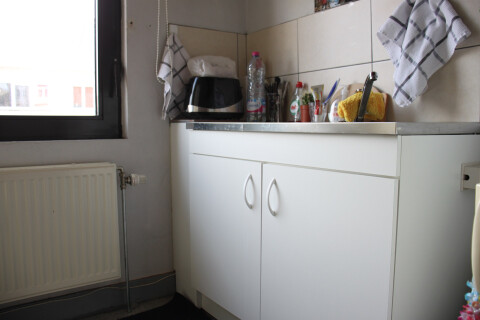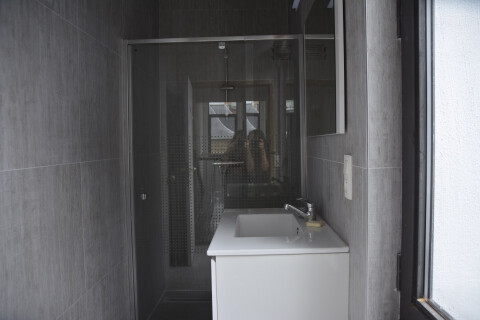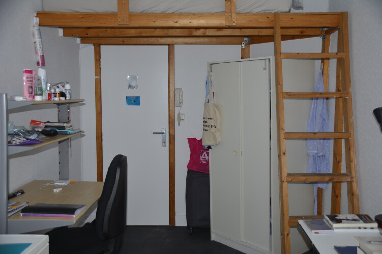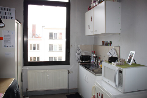 Kamer 15 is een kleine, gezellige kamer op de 2de verdieping van het gebouw met hoogslaper en kitchenette. Je deelt de WC en badkamer op de gang met andere kot genoten. De badkamer werd in de zomer van 2019 volledig vernieuwd. De kamer wordt verhuurd met een éénpersoons matras, boekenkast, kleerkast, bureau en bureaustoel.