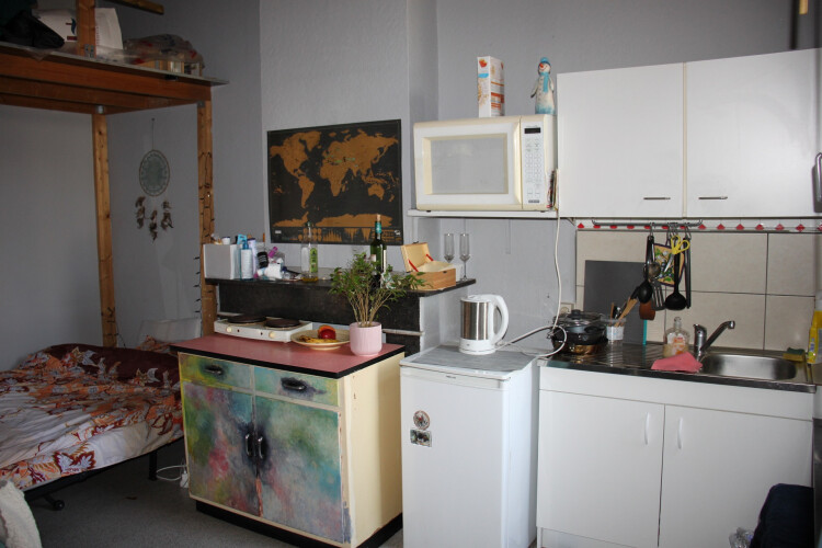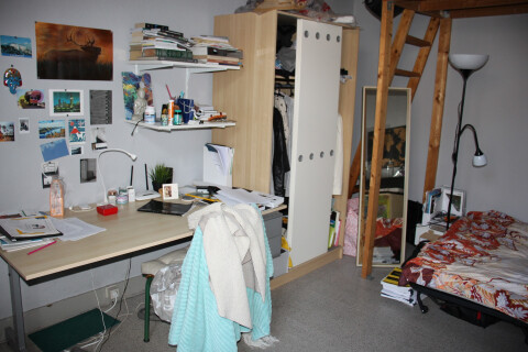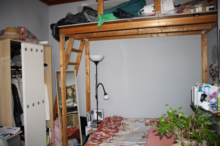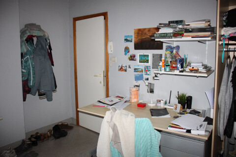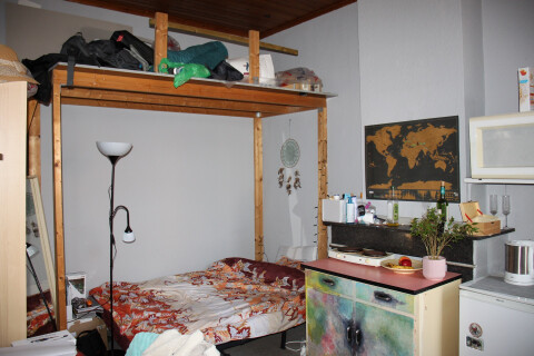 Kamer 17 ligt op de 2de verdieping van het gebouw en heeft een hoogslaper en kitchenette. Je deelt de WC en badkamer op de gang met andere kot genoten. De badkamer werd in de zomer van 2019 volledig vernieuwd. De kamer wordt verhuurd met een éénpersoons matras, boekenkast, kleerkast, bureau en bureaustoel.