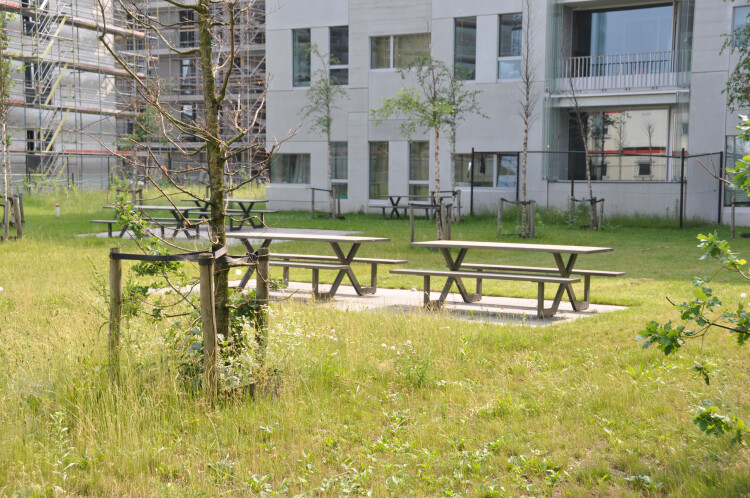 Groene omgeving met tuin en buitenbanken om eventueel buiten te studeren.