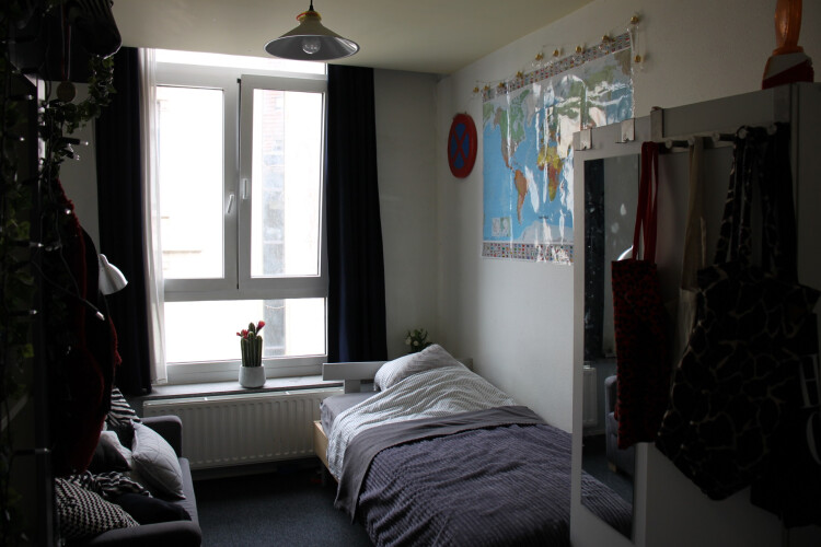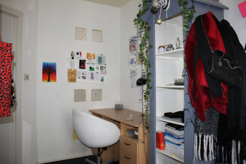 Kamer 10 is een gezellige kamer aan de voorkant van het gebouw. Je kamer ligt net naast de keuken en tegenover de badkamer die je beiden deelt met je huisgenoot in kamer 9. De kamer is voorzien van een bed, kast, ijskast en bureau.