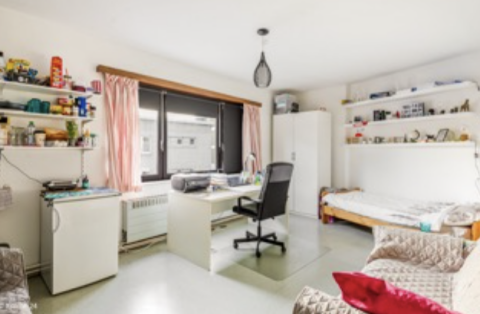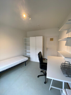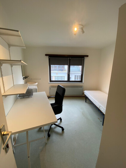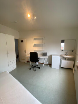 Bemeubelde kamer met eigen lavabo en koelkast in een kleinschalig gebouw, ideaal gesitueerd tegenover campus Middelheim.