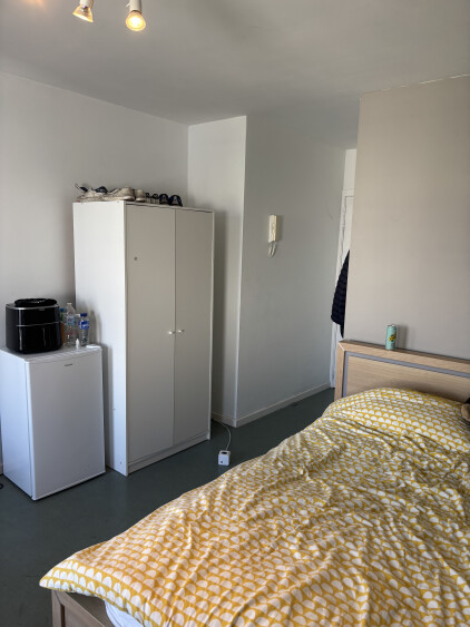 Prachtig kot met ruime privé badkamer en terrasje te huur in modern gebouw met lift en fietsstalling .