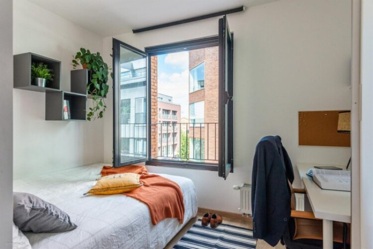 De studentenkamer geeft een ruim gevoel, is modern afgewerkt en bemeubeld met een bureau, kast en bed. Het bed kan zowel enkel als dubbel gebruikt worden, wat de studentenkamer een enorme meerwaarde geeft. Ook beschikt u over een eigen koelkast en een afgesloten badkamer met wastafel, douche en hangtoilet. Op de benedenverdieping bevindt zich de gemeenschappelijke, open keuken met gezellige eetruimte (45m2). Er is een overdekte berging voor de fiets. INTERNET INBEGREPEN !! Geen onverwachte kosten.