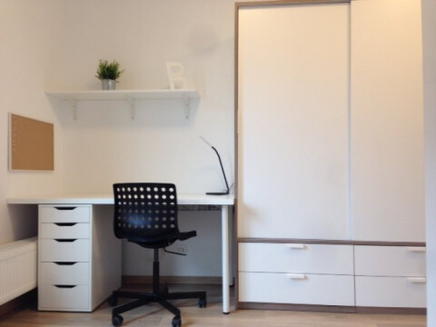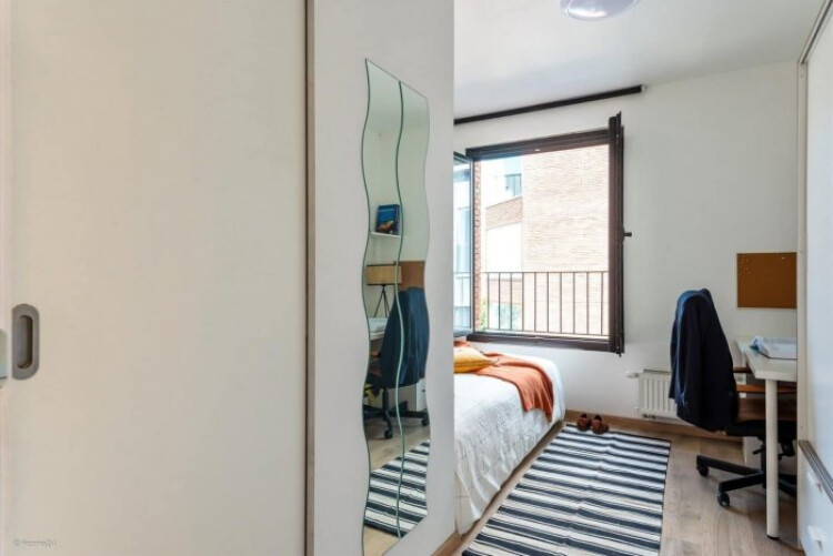 This new and bright student room is located in a trendy neighborhood (Cadix), closeby the Nautical school and the university district. The room furnished with a bed, closet and desk and a personal bathroom with shower & toilet. The kitchen is shared and next to a common living area (45m2). There is a secured bicycle garage available. INTERNET INCLUDED!! No unexpected costs! !