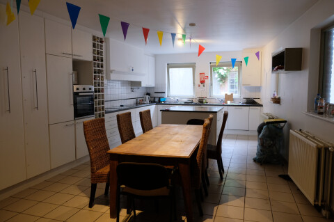 Ingerichte keuken voor gezamenlijk gebruik (kookvuur, dampkap, spoelbak en microgolfovens,…). Er is ook keukengerei aanwezig. (potten, pannen, borden, glazen,…)