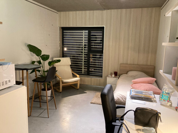 This modern, fully furnished student room has a surface of 20 square metres and is located in a modern student house (called MiPa) of 27 rooms. The room has its own fridge (incl freezing compartment) and its own bathroom with toilet, lavabo and shower.