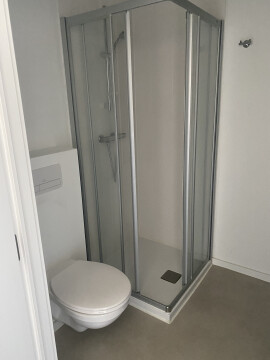 De badkot is privé en beschikt over een douche, toilet, wastafel en opbergkast. De keuken wordt gedeeld met de andere studenten op de verdieping en is volledig uitgerust met een combi-oven, koelkast, vaatwasmachine, elektrische kookplaat en een ruime eettafel. Er is bovendien voldoende opbergruimte voorzien voor keukengerei en voedingswaren.
