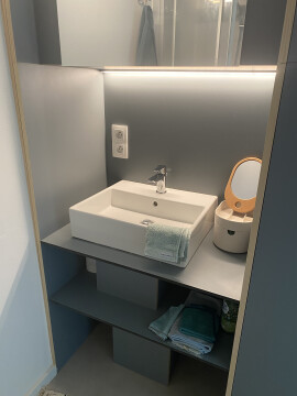 De badkamer is privé en beschikt over een douche, toilet, wastafel en opbergkast. De keuken wordt gedeeld met de andere studenten op de verdieping en is volledig uitgerust met een combi-oven, koelkast, vaatwasmachine, elektrische kookplaat en een ruime eettafel. Er is bovendien voldoende opbergruimte voorzien voor keukengerei en voedingswaren.